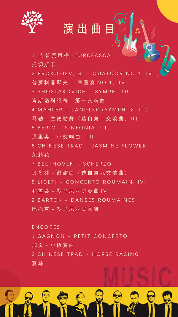 本次演出曲目选择风格特别多样性,从大型的交响乐,包括马勒的交响曲到民族民间舞曲,具有地域特色的作曲家的音乐,匈牙利、罗马尼亚的音乐等;在编曲上也很多样性,选择一些民间的小舞曲,有的甚至只有一句主题,延伸到9个人的演奏形式。